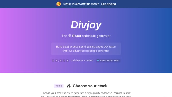 TemplateThe React codebase generator. Divjoy handles all the integration details. From routing to React hooks, you'll have everything you need to build something great.
